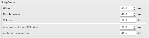 Hier können die Abmessungen von der Sudpfanne eingegeben werden, das Volumen wird dann berechnet.