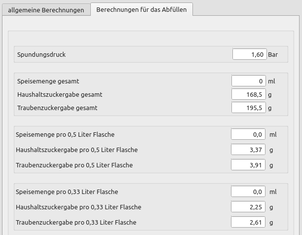 Außerdem wird auch die benötigte Speise- bzw. die Zuckermenge für die Nachgärung berechnet.