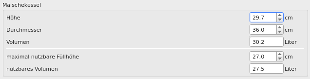 Hier können die Abmessungen vom Maischekessel eingegeben werden, das Volumen wird dann berechnet.