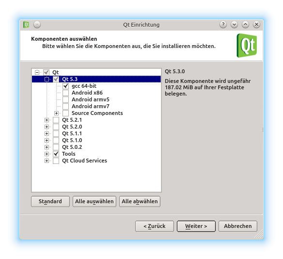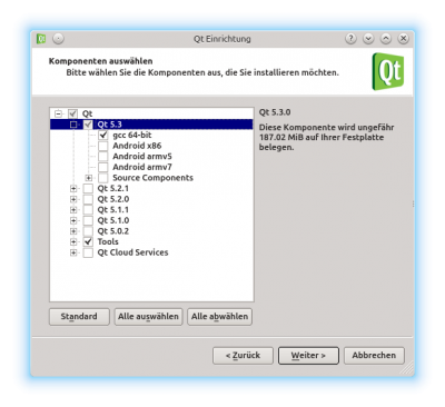 Von der qt-project Seite den Installer herunterladen und mit der Einstellung wie im Bild zu sehen installieren.